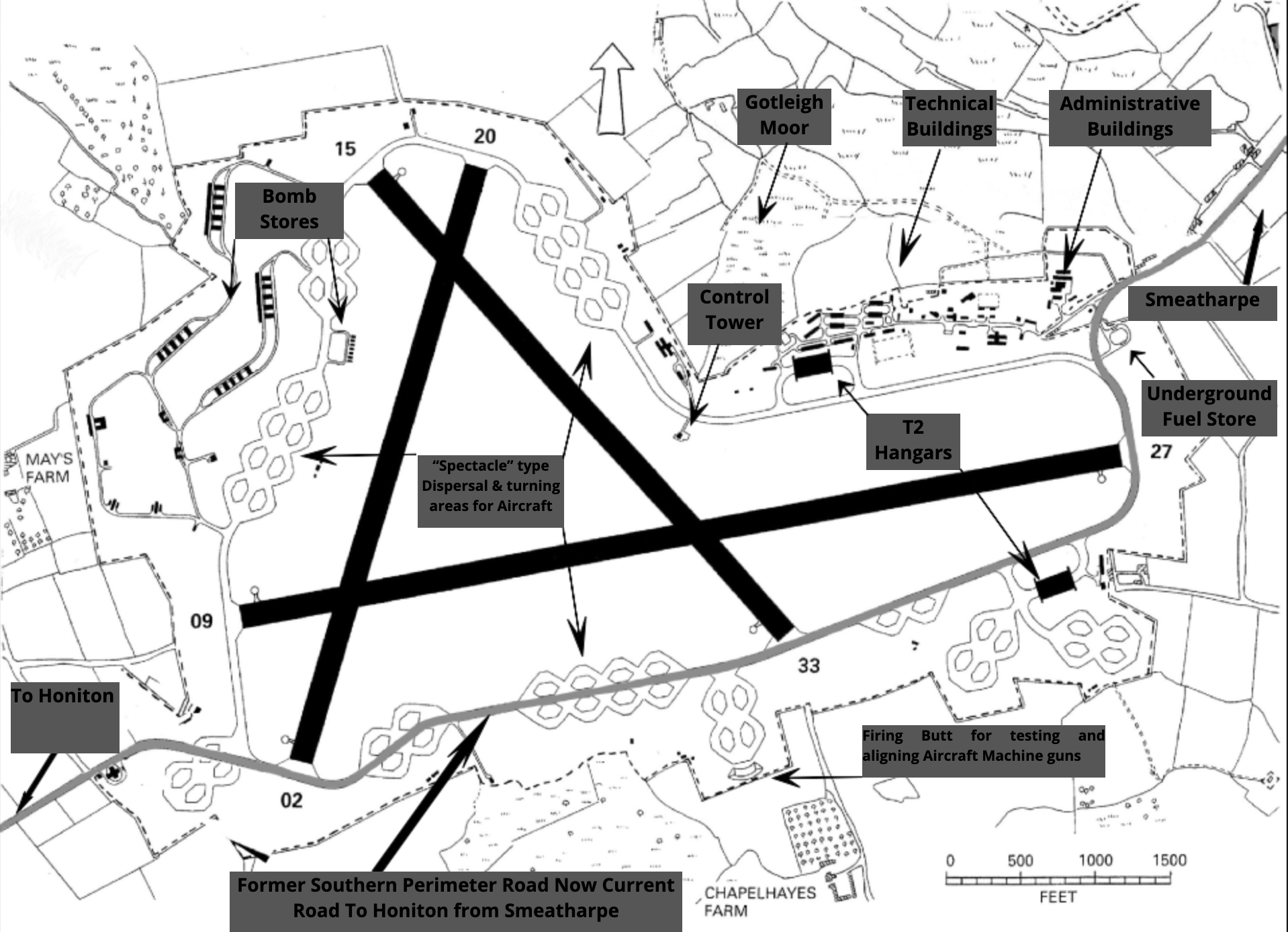 These became the standard dispersal and marshalling provision on bomber stations, this was in contrast to those at nearby Dunkeswell which were predominantly of the “Frying Pan” type. Built to the operational RAF standard of “Class A” with three strips at near 60 degrees to each other, the main strip being 2,000 yards by 200 yards, and the two subsidiary strips 1,400 yards by 200 yards.