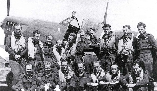 From left to right – Squadron Leader Antoni Wczelik, Flying Officer Adam Fliśnik, Sergeant Witold Krupa (with a mascot-dog), unknown, Sergeant Jan Śmigielski; Flying Officer Bohdan Arct (in the background), unknown, Flight Lieutenant Tadeusz Czerwiński