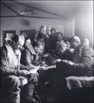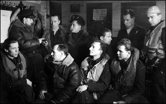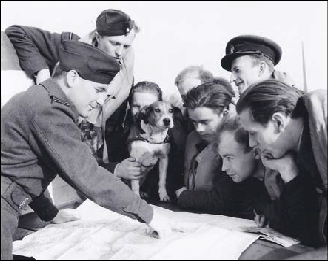 Squadron Leader Antoni Wczelik, the CO of No. 306 Polish Fighter Squadron, briefing his pilots on the next operation with mascot in attendance at RAF Churchstanton, 26-28 January 1942. © IWM CH4789)The Polish Squadrons often had dogs for mascots: the 306 Squadron mascot is pictured attending a squadron briefing.