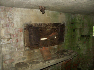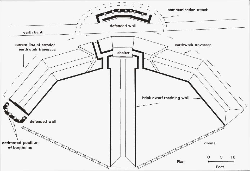 In all cases the plan-form of the pens followed that of the standard design with three traversed arms and dwarf brick walls forming the standard shape of the type “B” fighter pen. Normally a precast concrete shelter was located at the rear of the central arm but, the pens on the east side with sandbag walls had a brick-built air-raid shelter within the front of the central arm. At the front of this on two of the pens was the defended position consisting of a loopholed wall.