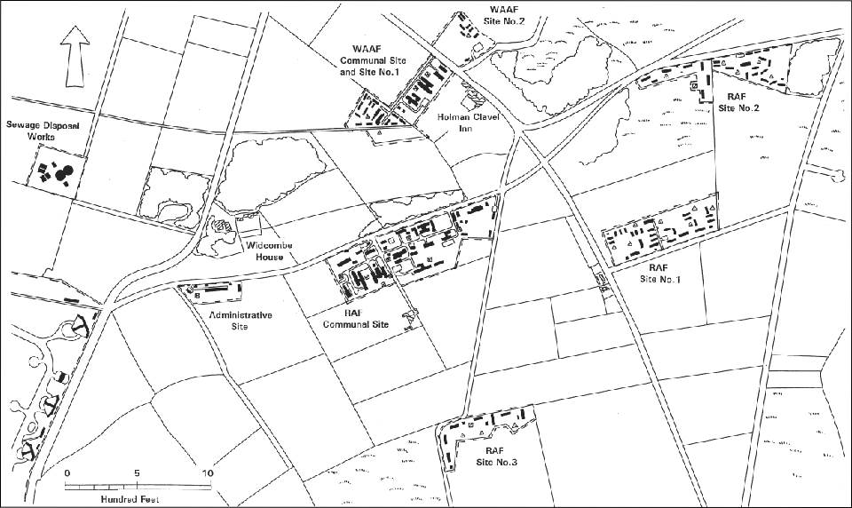 These were provided within six dispersed sites located in the local area to the north-east. All domestic sites were located close to public roads to keep lengthy Air Ministry connecting roads to a minimum. Huts were erected without symmetry or pattern and where possible as an aid to concealment, they were positioned close to hedge lines.  From 1 March 1941, Nissen-type hutting was made available and eventually these were used as an alternative to both temporary brick and Laing hutting.