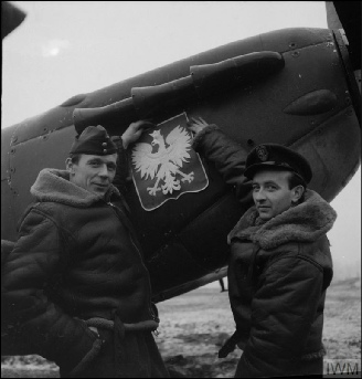 Flight Lieutenant Tadeusz Czerwiński, the CO of “A” Flight of No. 306 Polish Fighter Squadron, and Flight Lieutenant Stanisław Skalski, the CO of “B” Flight, with the Polish national emblem. RAF Churchstanton, 26-28 January 1942.
